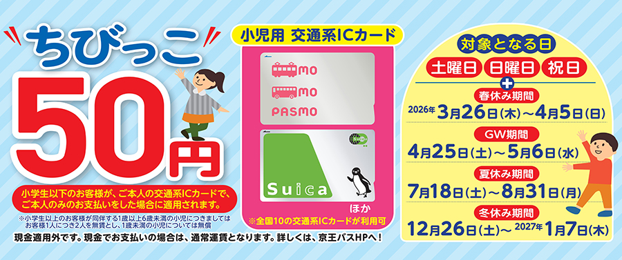 対象日に、小学生以下のお客様は指定のお支払い方法に限り50円でご乗車いただけます。