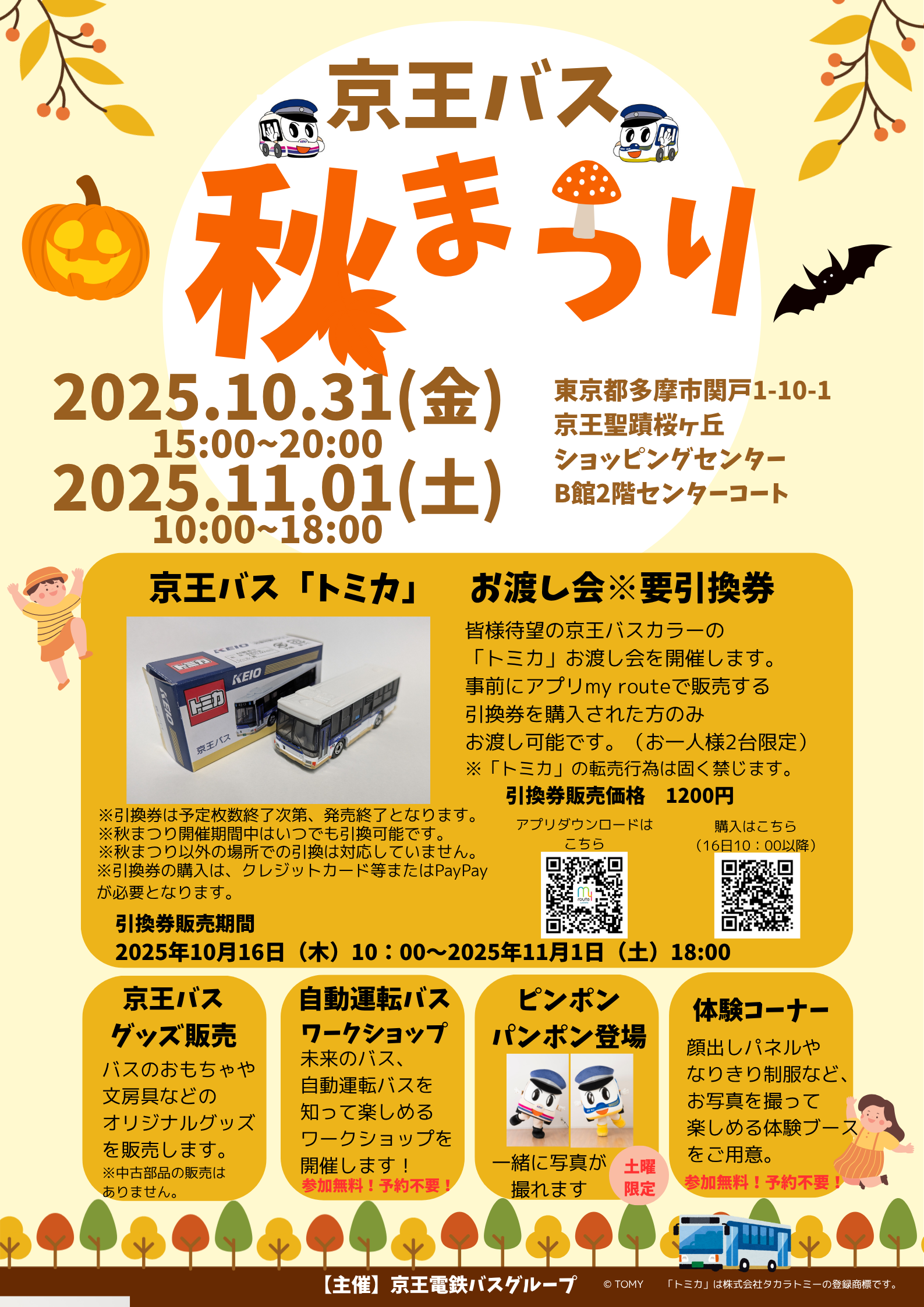《京王バス秋まつり開催決定!京王バスカラーの「トミカ」のお渡し会を実施いたします。》 大好評だった『京王バス夏まつり』に続き、『京王バス秋まつり』を「京王聖蹟桜ヶ丘ショッピングセンター」にて開催いたします!